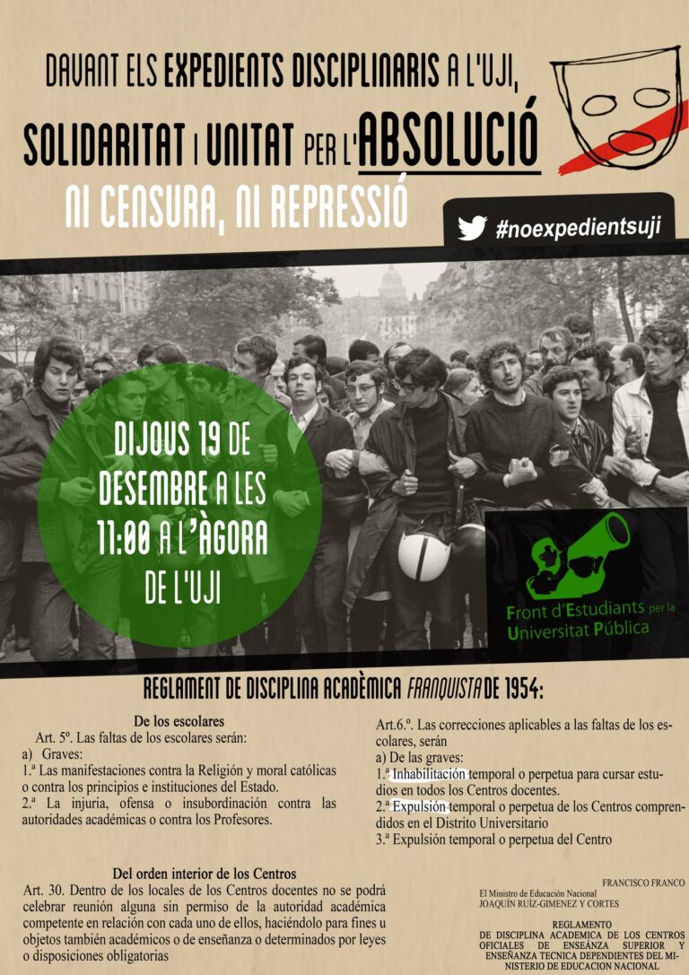 Davant els expedients disciplinaris a l’UJI, solidaritat i unitat per l’absolució. Ni censura ni repressió!  Arran de la xerrada de “Música combativa” celebrada en l’UJI i organitzada pel mateix Front d’Estudiants per la Universitat Pública, el Rectorat de la universitat ha sucumbit a poders externs i ha obert expedients disciplinaris a 3 alumnes, que poden suposar l’expulsió o la pèrdua del dret a examen.