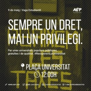 Així doncs, la recollida de signatures de la ILP Universitats és una passa de moltes i el 9 de maig una data assenyalada de nou al nostre calendari. Que cada facultat, cada centre d’estudis, sigui en vaga aquest dijous; que cada estudiant participi de les mobilitzacions; que cada una de nosaltres ens trobem a les 12:00h a Plaça Universitat defensant el dret a l’educació.