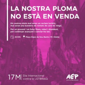 Per cada un d’aquests motius, per cada una de les experiències que vivim diàriament, aquest 17 de maig, Dia contra la LGTBfòbia, cridem que la nostra ploma no es ven: que hem aconseguit molts canvis, però hem vingut canviar-ho tot.