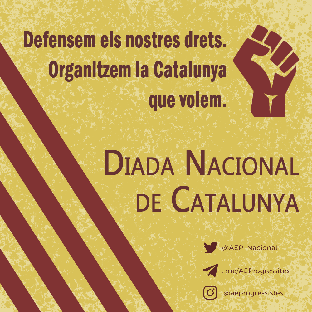 Enguany viurem una altra Diada marcada pel context de la Covid-19, tot i així des de l’Associació d’Estudiants Progressistes volem reafirmar el nostre compromís en la lluita d’un poble unit i treballador cap a unes bases socials lliures de les urpes del sistema opressor capitalista, una terra que prengui com a referència la lluita feminista, LGTB, ecologista, antiracista i amb consciència de classe.